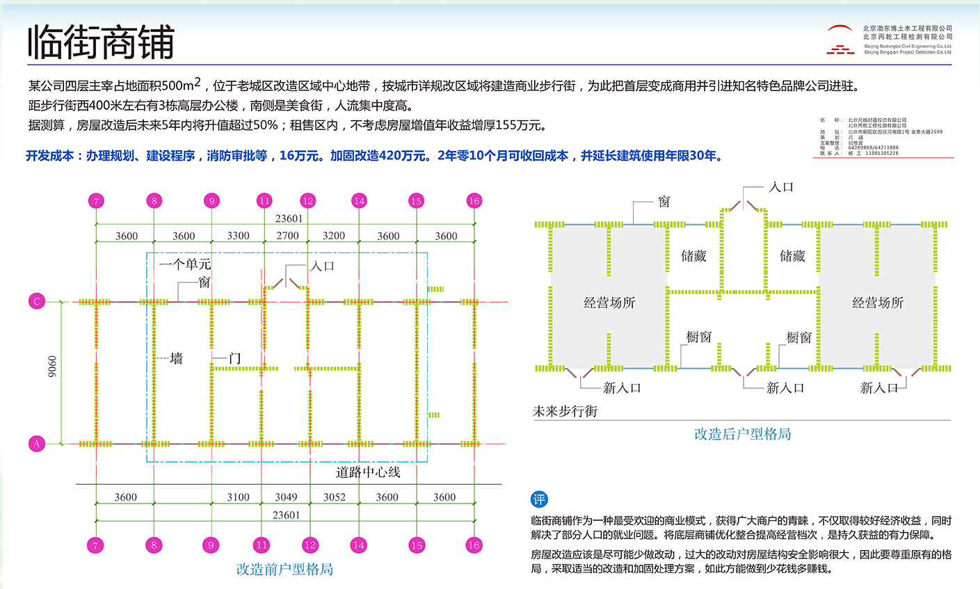 开发成本:办理规划,建设程序,消防审批等,16万元,加固改造420万元,2年零10个月可收回成本,并延长建筑使用年限30年